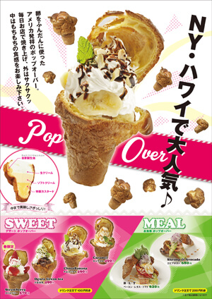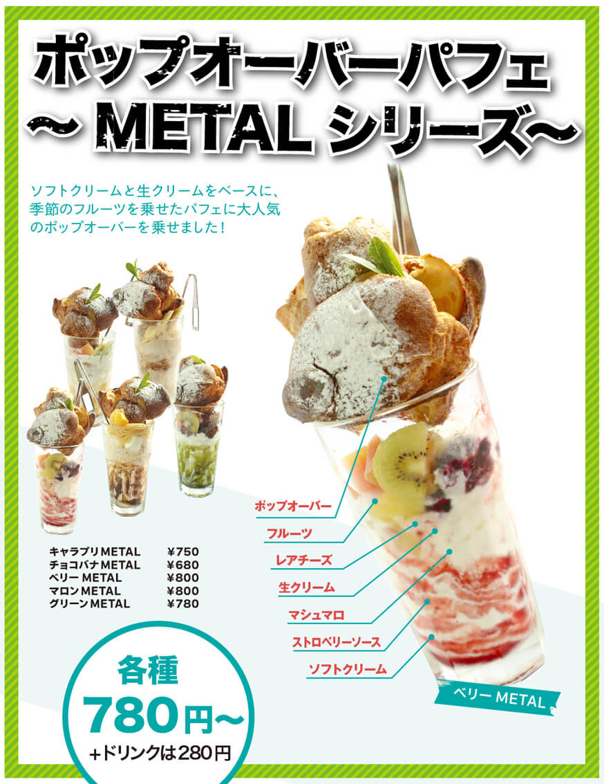 まったく新しいパフェが爆誕!ソフトクリームとふわふわ生クリームをベースに各メニューに季節のフルーツを乗せたパフェに大人気のポップオーバーを乗せました!お好みで生地に挟んで楽しんでください! キャラプリMETAL