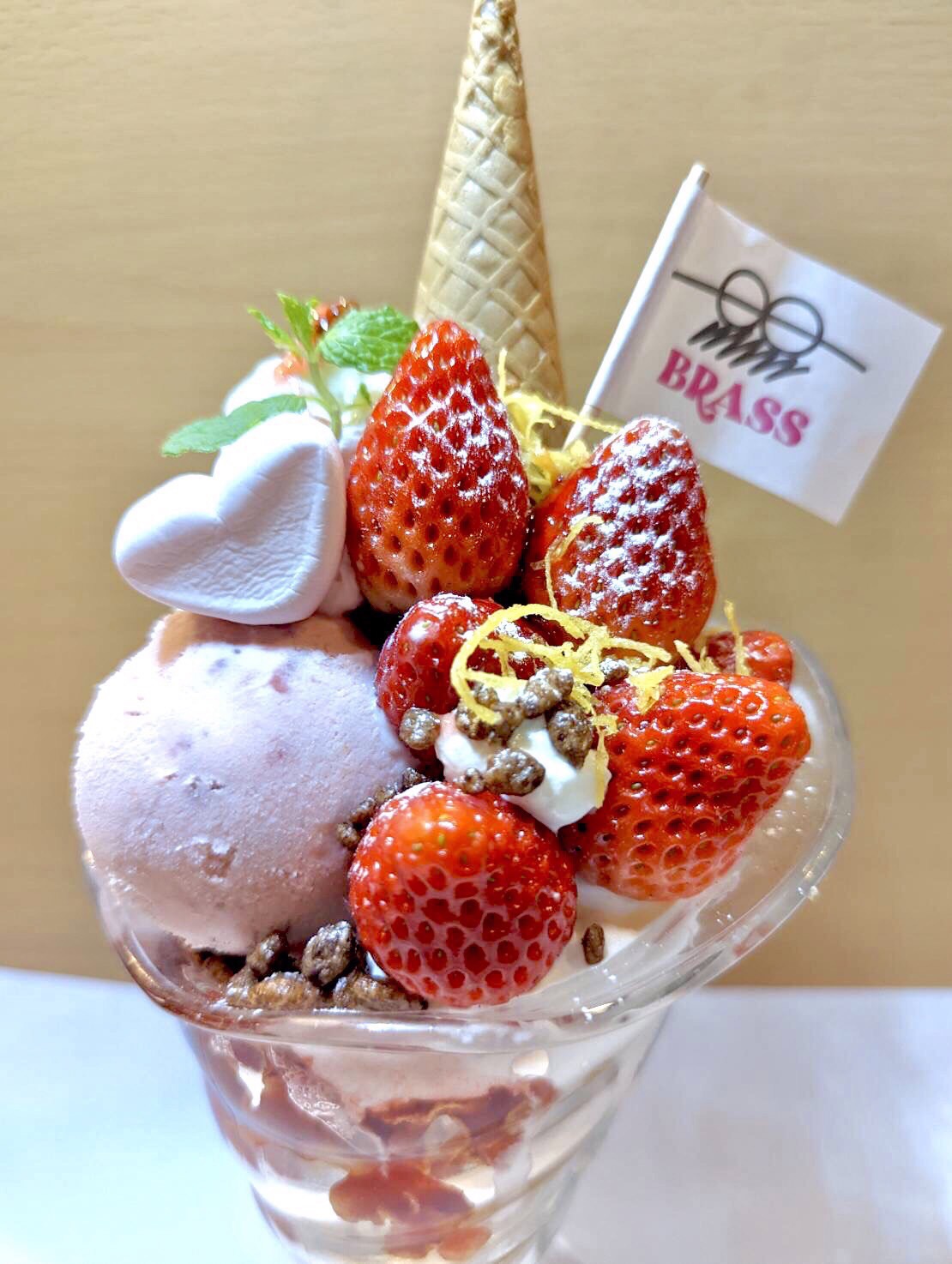 地元のいちごの使ったストロベリーパフェ地元のいちごとを使い、いちごの甘酸っぱさに合う練乳をブレンドした濃厚生クリームを使用してます。!