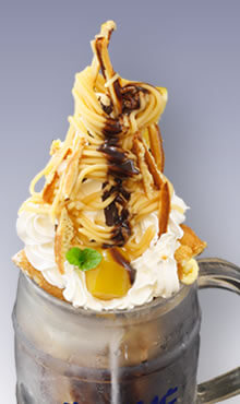 ジョッキシリーズ樽ジョッキを使ったかわいらしいパフェ。個性あふれたラインナップが人気です!(オリーブ、ポパイなど) All 820円★boon[ブーン](写真左)樽底にプリン、コーヒゼリー上にはアイスクリームとマロンクリームを添えた欲張りなあなたに是非オススメな1品! ★Olive[オリーブ]★Popeye[ポパイ]★brutus[ブルータス] |